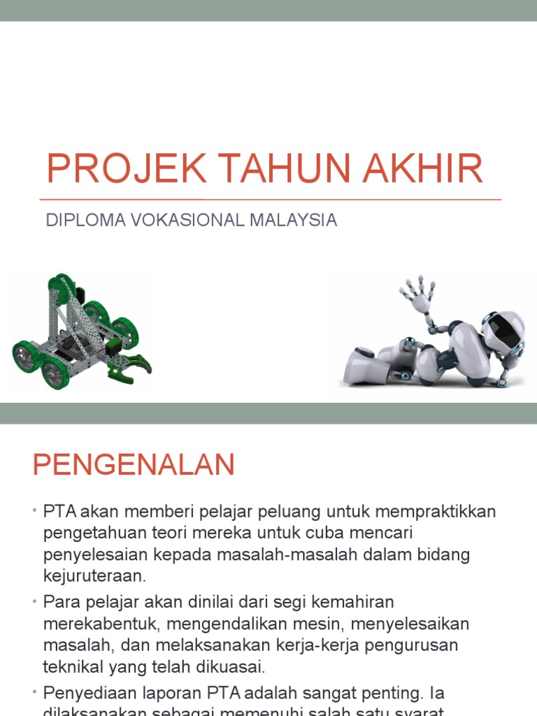 Projek tahun akhir kolej vokasional. View contoh slide projekpptx from mechanical 40092 at politeknik kota bharu. Pelaksanaan Projek Tahun Akhir PTA adalah bagi pelajar-pelajar semester akhir.
